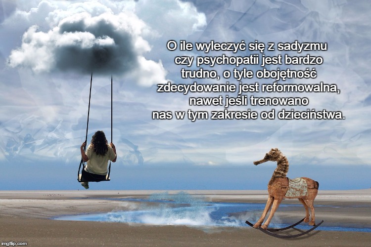 O ile wyleczyć się z sadyzmu czy psychopatii jest bardzo trudno, o tyle obojętność zdecydowanie jest reformowalna, nawet jeśli trenowano nas w tym zakresie od dzieciństwa. Ustawa o ochronie zwierząt niestety odzwierciedla ten prawdziwy, wciąż aktualny obraz społeczeństwa, które potępia sadystów, degeneratów i okrutników, ale ze swoją obojętnością wciąż nie postanowiło się rozprawić. A to właśnie ta obojętność jest odpowiedzialna za systemowe krzywdzenie zwierząt na ogromną skalę.